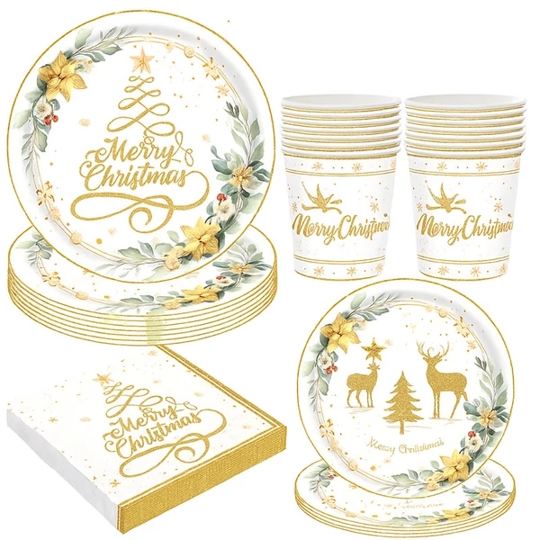 Ez a 80 darabos karácsonyi parti asztali készlet elegáns, fehér-arany színvilágával tökéletes kiegészítője az ünnepi asztalnak. A klasszikus „Merry Christmas” motívummal díszített szett hangulatos megjelenést biztosít karácsonyi vacsorákhoz, családi összejövetelekhez, céges partikhoz vagy akár szilveszteri eseményekhez. A kiváló minőségű, erősített papír anyag egyszer használatos, mégis tartós és környezetbarát megoldást kínál.