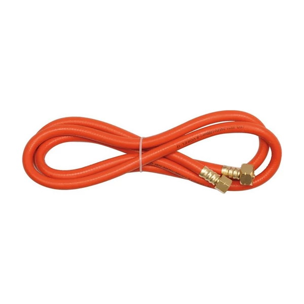 Kiváló minőségű 2 méteres gáztömlő, amelyet PB-gázpalackok és gázégők, illetve háztartási vagy ipari gázkészülékek közvetlen csatlakoztatására terveztek. A tömlő mindkét végén fém hollandis csatlakozó található, balmenetes belső menettel, amely biztonságos és szivárgásmentes összeköttetést biztosít.