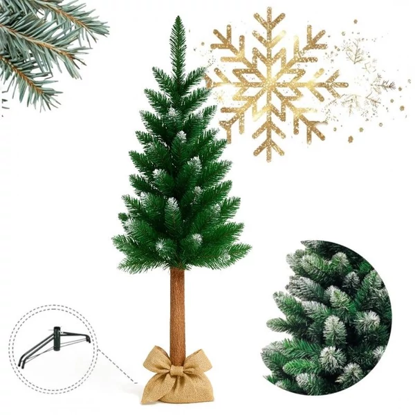 A fa valódi fenyőtörzsre épül, amelyet fém talp és dekoratív juta borítás egészít ki, ezáltal elegáns, természetes megjelenést kölcsönöz. A fenyő kellemes, természetes illata még élethűbb hatást kelt.
